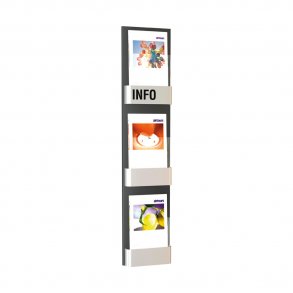 Våre veggbrosjyreholdere er den perfekte løsningen for en plassbesparende, men likevel profesjonell presentasjon av flygeblader, brosjyrer og kataloger. Enten det er innendørs eller utendørs: en brosjyreholder fpr vegg sikrer en strukturert og praktisk presentasjon av informasjonsmaterialet. Installasjonen er svært enkel med skruer – ideell for salgslokalet, inngangspartier, venterom eller messer.