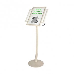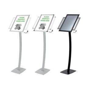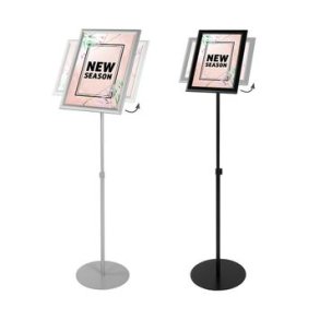 Informasjonsstativet for reklame og informasjon utendørs på en stilig og diskret måte. Det fungerer som en veiviser, oppslagstavle eller prisliste, og sikrer at kundene får tydelig informasjon. Stativet er ideelt for utendørs bruk hvor det er hensiktsmessig. Snap- eller klikkrammen er med en spesiell forsegling og profilteknologi som beskytter mot regn. En gummipakning rundt kantene på bakplaten gir ytterligere beskyttelse, og bakplatene er laget av værbestandig polystyren. En antirefleks, UV-stabilisert dekkfilm beskytter plakater mot falming og gjør dem enklere å lese i sollys. Rammen kan benyttes i både portrett- og landskapsformat ved en egen roteringsmekanisme, som tillater et bredt spekter av bruksområder. Med den sorte pulverlakkerte stålkonstruksjonen, er stativet stabilt og kan sikres mot tyveri ved å feste stativet til underlaget med to hull i foten (festemateriale er ikke inkludert). Informasjonsstativet kan også skreddersys i andre størrelser eller farger ved bestillinger av 20 enheter eller mer.