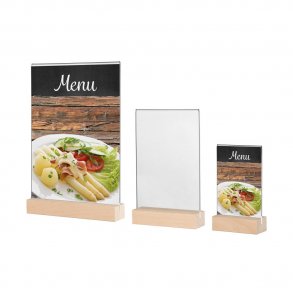 De ulike menyholderne kan kombineres med forskjellige stativ. Foten av tre, aluminium eller plast bestemmer i stor grad designet. Mens trematerialet står for en naturlig presentasjon, har akrylfoten et enkelt utseende. Den helt gjennomsiktige holderen sørger for at bare innholdet ditt fanger blikket.